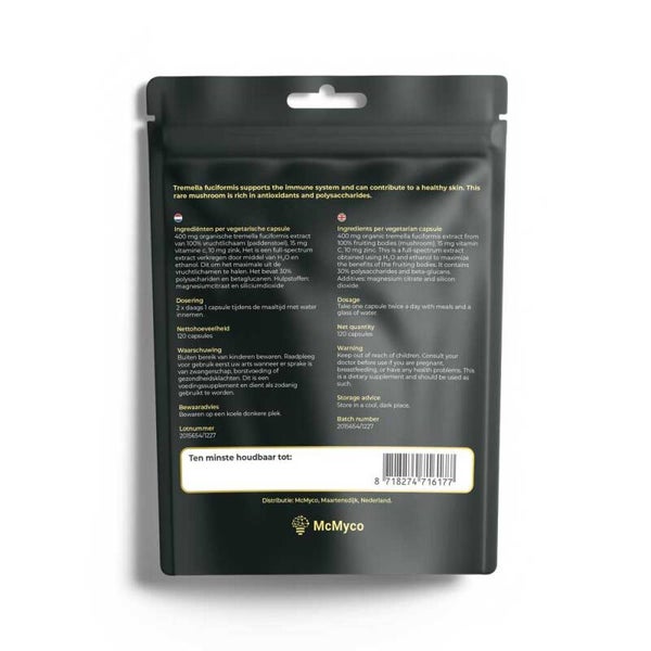 Voor extra effectiviteit zijn de McMyco Tremella Fuciformis capsules verrijkt met Vitamine C en Zink. Deze combinatie ondersteunt het immuunsysteem en bevordert het energieniveau.